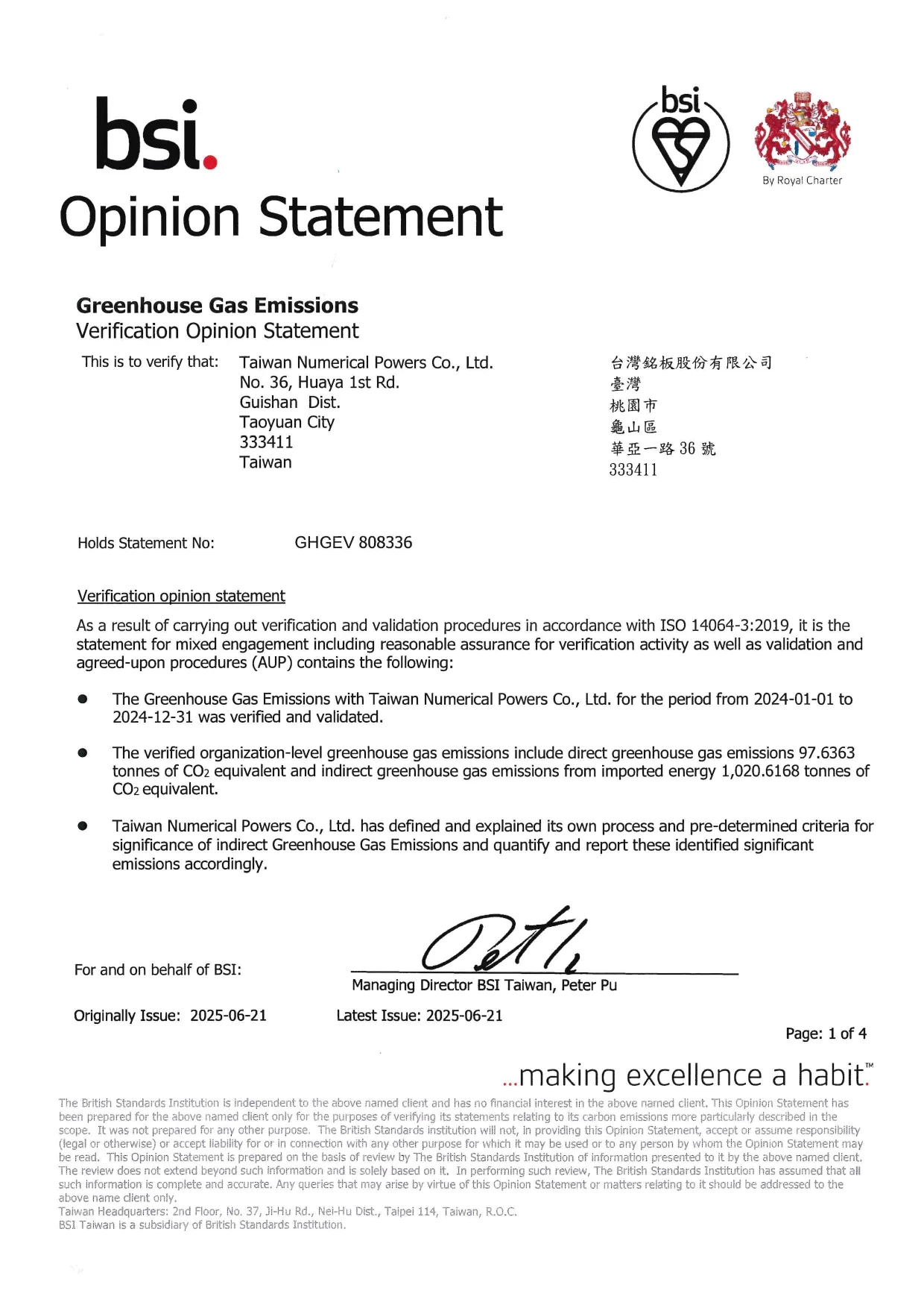 - 2024年導入ISO 50001能源管理系統以提升能源績效,且每年皆針對ISO 14001環境管理系統及ISO 14064-1溫室氣體盤查進行PDCA之有效性評量。